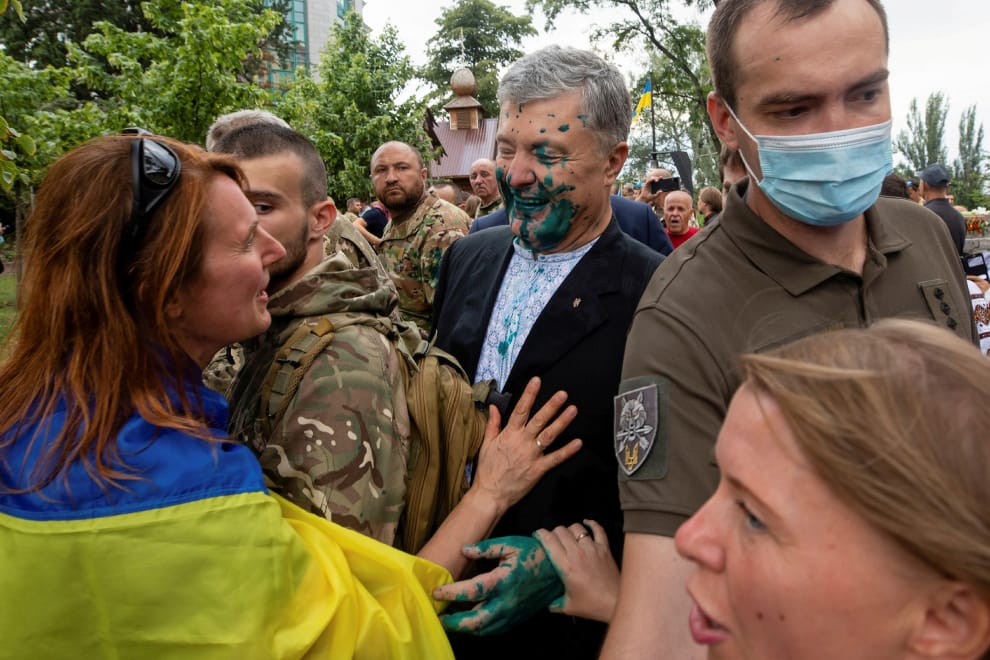 在烏克蘭獨立紀念日這一天,烏克蘭前總統波洛申科(Petro Poroshenko)在參加相關活動時遭到反對者潑綠漆攻擊。稍做整理後,他頂著綠漆的臉和支持者寒暄。