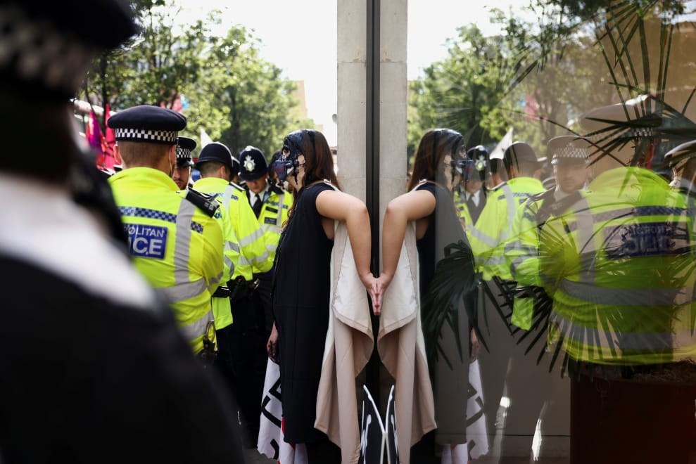 在倫敦熙來攘往的牛津街上,環保團體「滅絕反叛」(Extinction Rebellion)的成員把自己用膠水黏在高檔百貨公司塞爾福里奇(Selfridges)的門面上,和前來驅離抗議民眾的警察僵持不下。