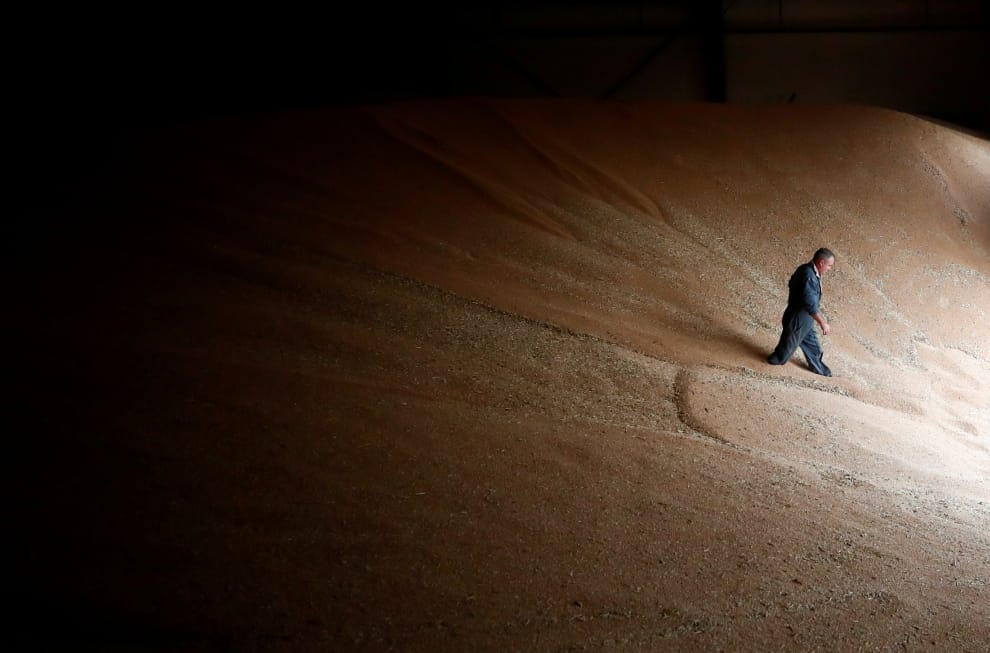 在靠近南特(Nantes)的維埃耶維涅小鎮(Vieillevigne),農夫夏泰利爾(Olivier Chatellier)走在他辛勤採收下的小麥中。