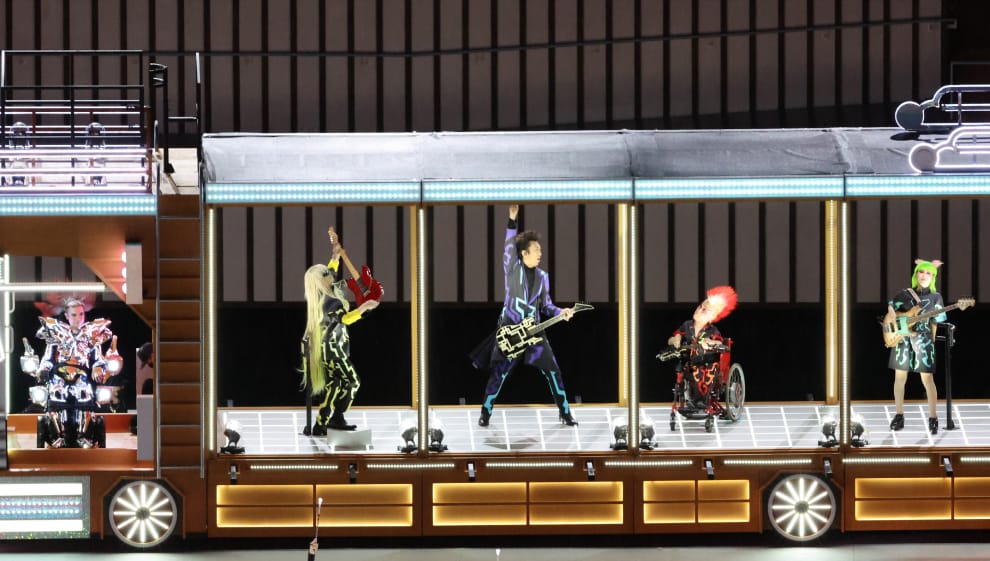 在帕拉林匹克運動會(Paralympic Games,簡稱帕奧)開幕式上,日本吉他手布袋寅泰(紫色西裝者)和身障樂手們在國立競技場一同帶來精彩的表演。本屆帕奧將於 2021年8月24日一路舉辦到 9月5日。