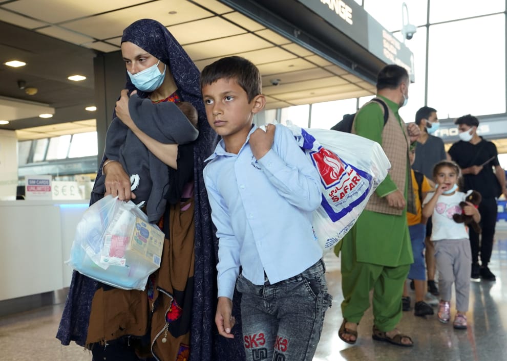 在維吉尼亞州的華盛頓杜勒斯國際機場(Dulles International Airport),來自阿富汗的難民剛剛下機,他們準備搭乘巴士前往難民處理中心。