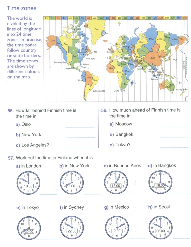 「芬蘭的教科書非常強調與生活情境的連結,內容非常『寫實』。」芬蘭的數學課本會提供非常具體的例子,作為教材也應用於學生的練習。像是給國小的課本,講到比例就會以實際的昆蟲放大縮小來舉例;上到時間判讀,就直接拿出全球的時區來上課。這樣的教材內容除了生活化,也讓學生可以非常快速認識實際應用場景。