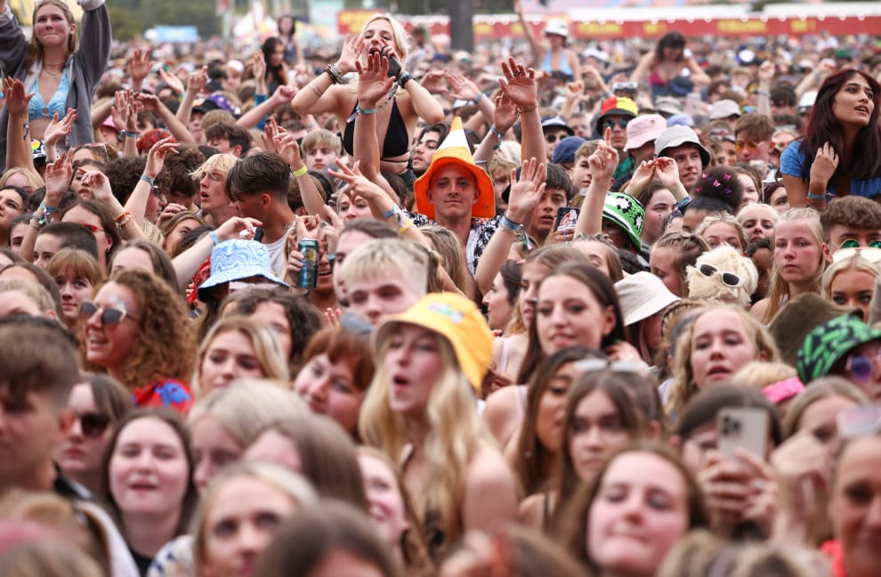 在里丁音樂節(Reading Festival)的現場,參加民眾跟著音樂一起搖頭晃腦,現場氣氛歡快。
