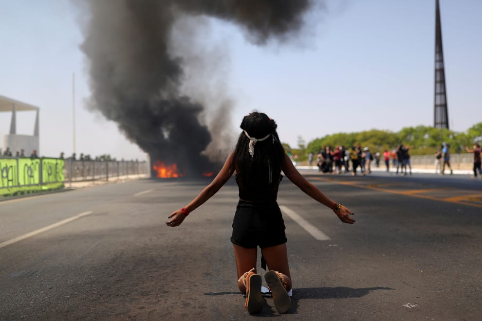 在巴西總統府普拉納托宮(Paláciodo Planalto)前,一名原民女子下跪祈求巴西總統波梭奈羅(Jair Bolsonaro)盡快下台,讓他們可以拿回屬於祖先的土地。
