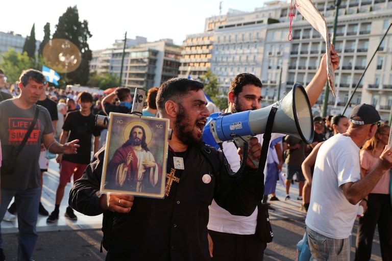 在雅典國會大廈外,超過 7,000人手持十字架、耶穌基督像抗議當局針對醫護人員頒布的疫苗政策。根據政府的規定,從今年 9月1日開始,想要上班的醫護人員都必須至少接種一劑COVID-19疫苗,要不然就得出示染疫後痊癒的證明,否則就不准工作。