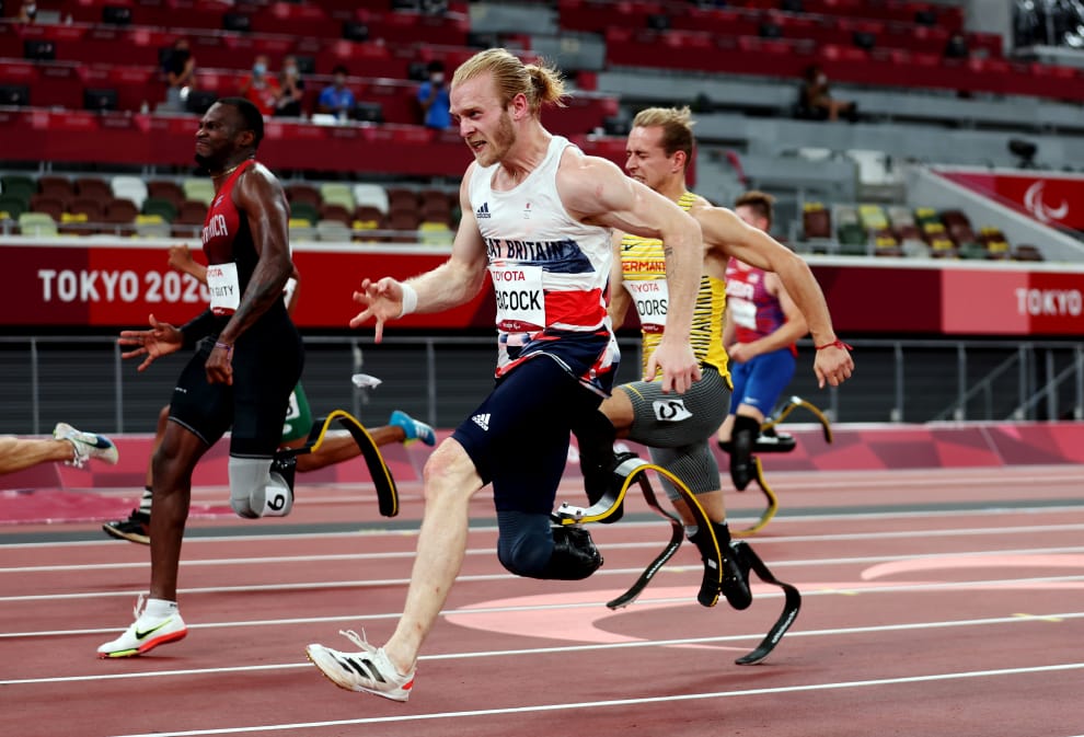 在 2020東京帕奧男子一百公尺T64級決賽上,各國選手奮力衝向終點線,最後由德國選手斯特倫(Felix Streng)奪金,哥斯大黎加選手古伊蒂(Sherman Isidro Guity Guity)奪銀,德國選手弗洛爾斯(Johannes Floors)和英國選手皮克(Jonnie Peacock)獲得銅牌。