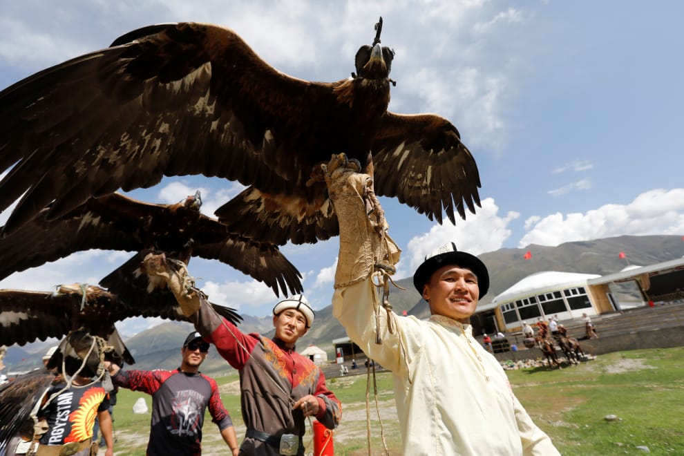 在伊塞克湖州(Issyk-Kul region)的基爾欽峽谷(Kyrchyn gorge),參加薩爾布倫(Salburun)狩獵節的獵人帶著他們馴養的獵鷹出場,準備大顯身手。