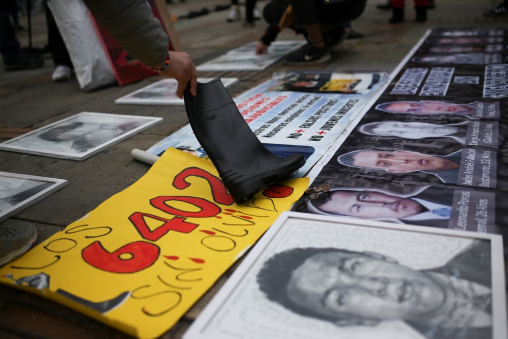 在首都波哥大的一座廣場,民眾將「偽陽性」(false positives)醜聞受害者的照片和海報擺在地上,海報上寫著「不會忘記那 6,402名被害者」。