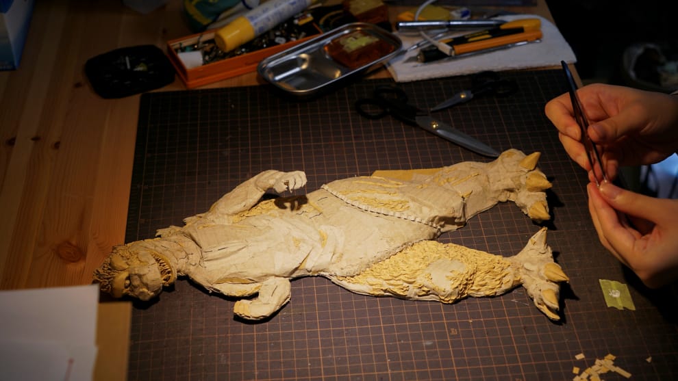 在東京,今年 29歲的紙雕藝術家大野萌菜美正在製作怪獸哥吉拉(Godzilla)的紙板雕像。