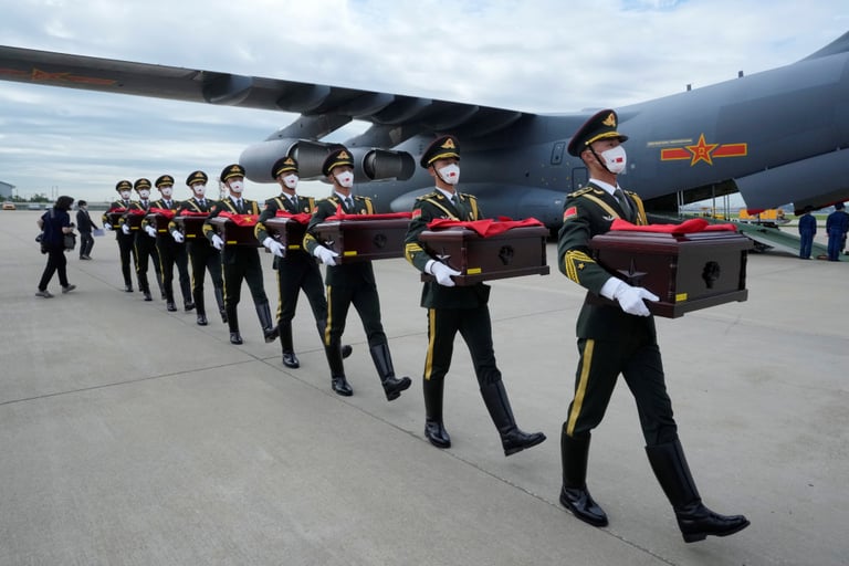 在仁川國際機場,中國榮譽衛隊手捧著中國軍人的遺骸,準備搭乘軍用運輸機返回中國。