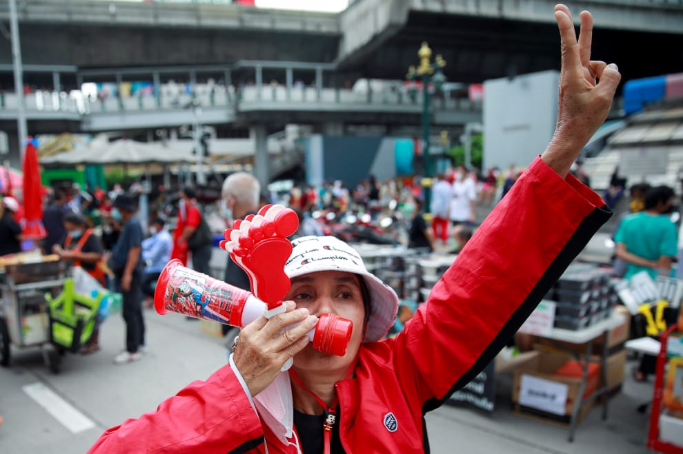 在泰國首都曼谷的一場反政府示威上,一名不滿於泰國政府防疫措施的示威者吹響玩具喇叭,要求泰國總理帕若育(Prayuth Chan)辭職下台。