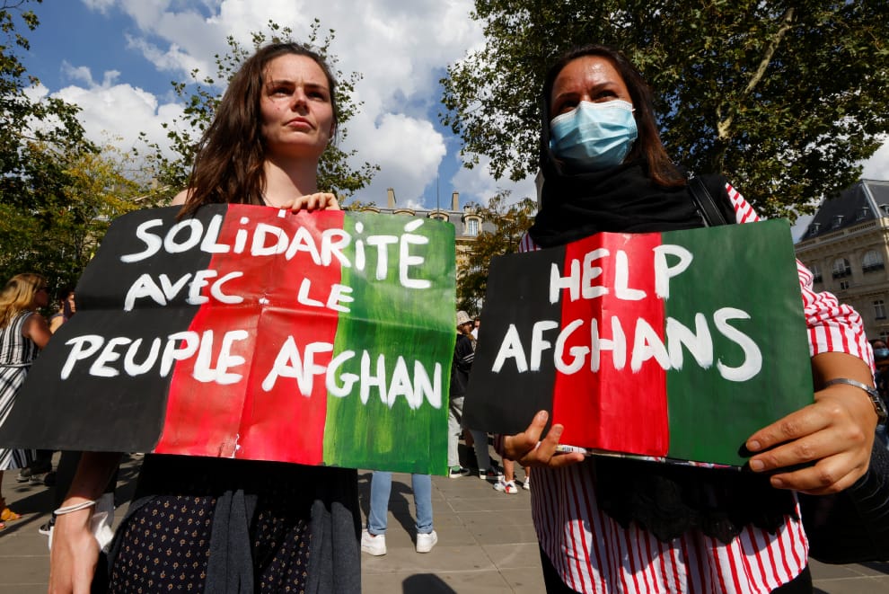 在法國首都巴黎,兩名反對阿富汗塔利班組織(Taliban)的示威者帶著標語上街,聲援如今正活在塔利班統治底下的阿富汗人民。