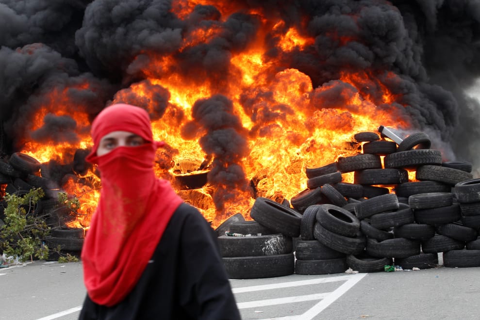 在東歐國家蒙特內哥羅西部的策提涅市(Cetinje),一名示威者站在一道熊熊燃燒的輪胎牆前,企圖阻止塞爾維亞東正教教會指派的若阿尼基耶二世(Joanikije II)前來就任蒙特內哥羅主教。