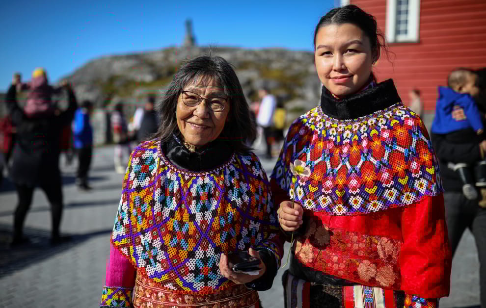 在格陵蘭首府努克市(Nuuk),兩名身著因紐特人(Inuit)傳統服飾的女性在受洗後,一起站在努克市教堂(Nuuk Cathedral)外合照。