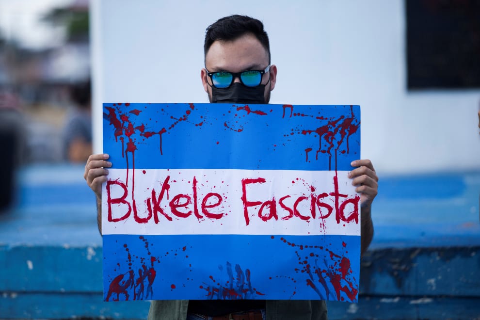 在薩爾瓦多首都聖薩爾瓦多(San Salvador),一名示威者帶著一張寫著「布格磊是法西斯主義者」(Fascist Bukele)的標語上街參加反政府示威,抗議薩爾瓦多最高法院的憲法法庭(Constitutional Chamber)為總統布格磊(Nayib Bukele)開綠燈,允許已經連任一屆的他參加 2024年的總統大選。