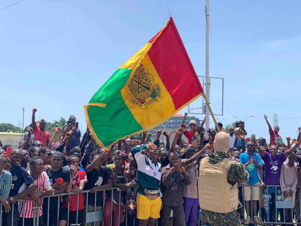 專家們紛紛警告,過去一年來西非各國政權更迭過程中發生的暴力事件,已經顯示西非地區出現了民主倒退的跡象。圖為在科奈克里市重要活動場地人民宮(Palace of the People),一名揮舞著幾內亞國旗的特種部隊士兵得到了民眾的熱烈歡呼。
