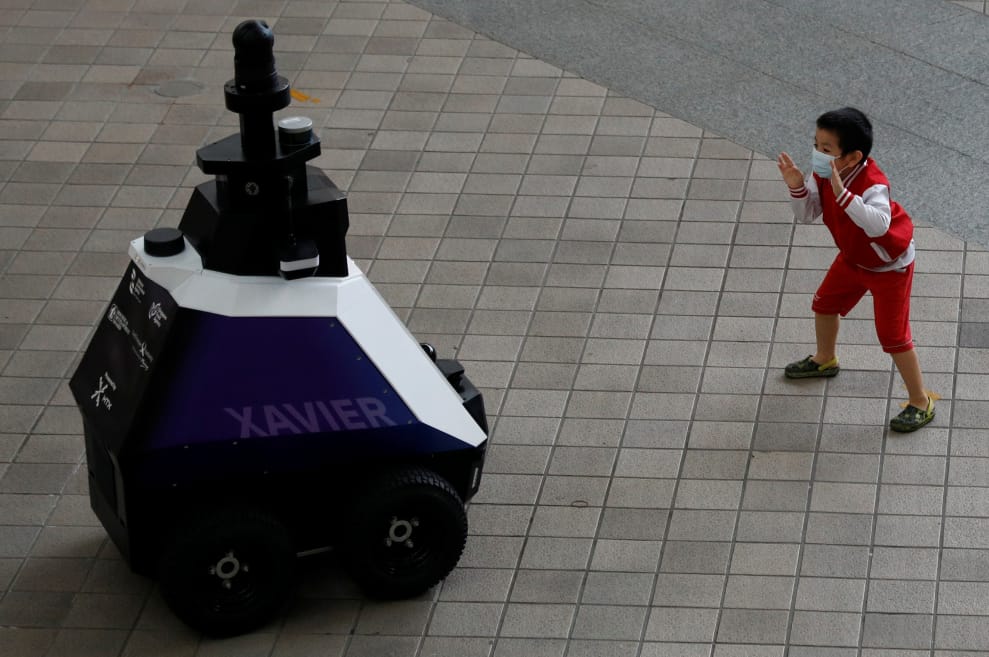 在新加坡的一間購物中心裡,一名孩子在全自動機器人Xavier的後面作勢要嚇唬它。未來三周,新加坡推出的機器人Xavier將扮演起部分警察的角色,四處巡邏偵察周遭是否有「不良社會行為」,像是不遵守COVID-19防疫規則、在禁菸區吸菸、腳踏車違停等。