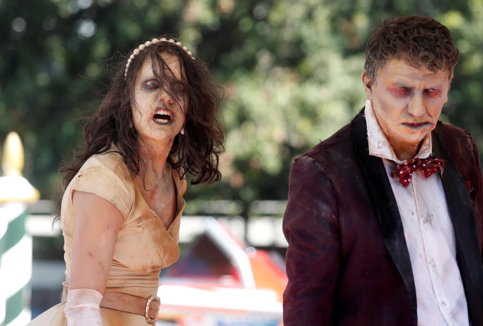 在義大利首都威尼斯的第 78屆威尼斯影展(Venice International Film Festival)上,兩名打扮成殭屍的民眾一起惡狠狠地望著鏡頭。