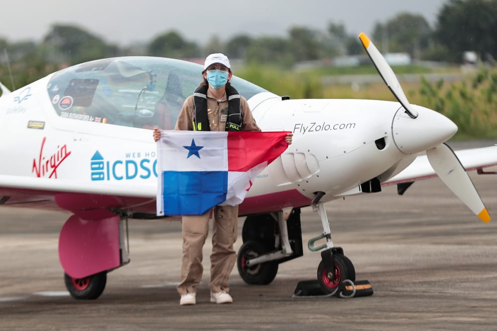 在巴拿馬首都巴拿馬市的托庫門國際機場(Tocumen International Airport),現年 19歲的英國飛行員魯瑟福(Zara Rutherford)手持巴拿馬的國旗,與她的超輕型飛機「鯊魚」(Shark)合照。