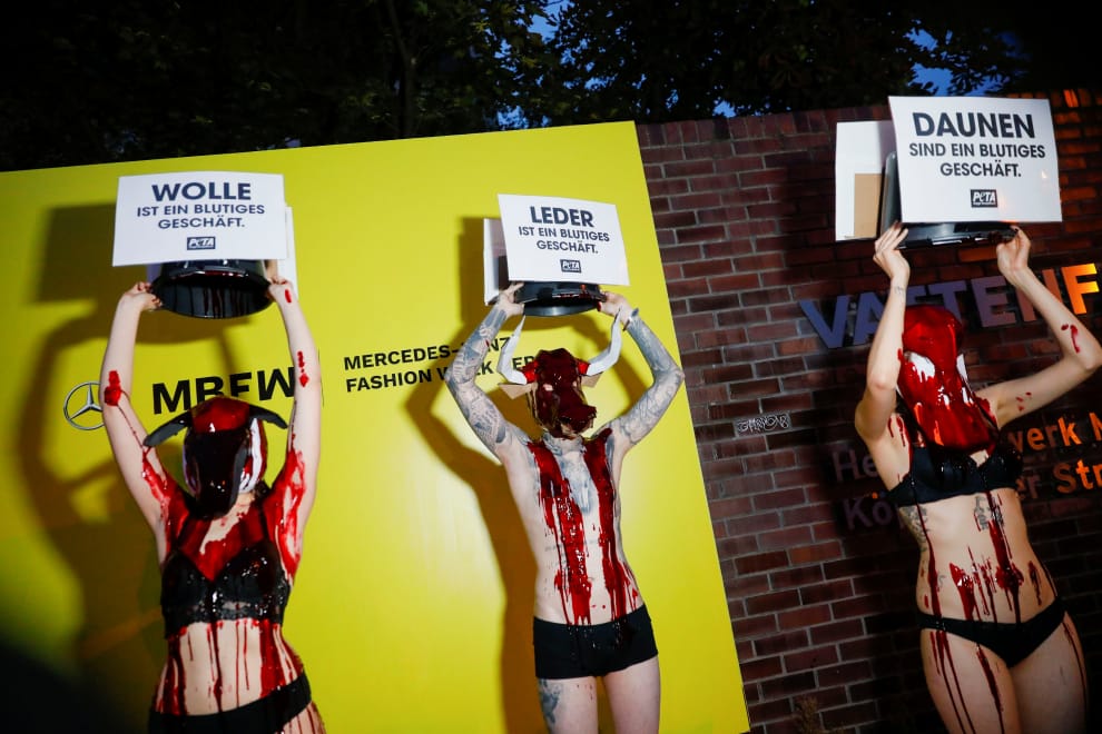 在德國首都柏林的柏林時裝周(Berlin Fashion Week)活動上,動保組織PETA的成員在設計師萊特納(Florentina Leitner)的同名品牌時裝秀開始前,到場外抗議時尚業大量使用動物的現象。