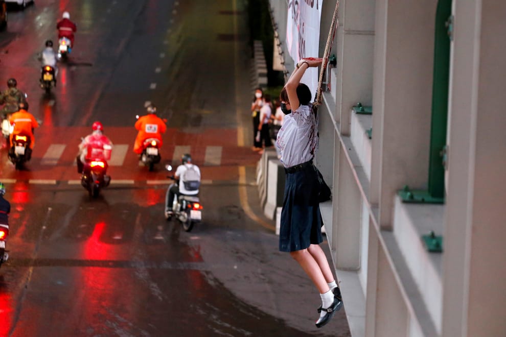 在泰國首都曼谷的一場反政府示威上,一名示威者把自己吊在天橋邊,抗議自COVID-19疫情爆發以來泰國政府防疫不力,同時也要求泰國總理帕若育(Prayuth Chan-ocha)下台負責。