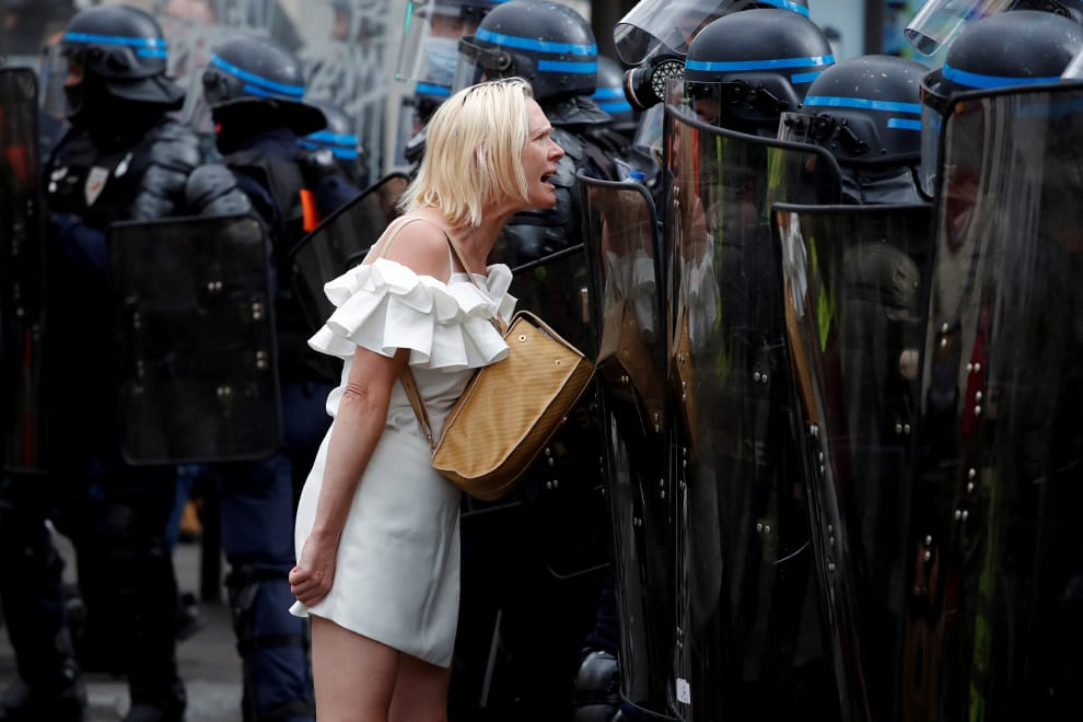 在法國首都巴黎,一名反對法國當局防疫政策的示威者,朝著一隊鎮暴警察激動地念念有詞。