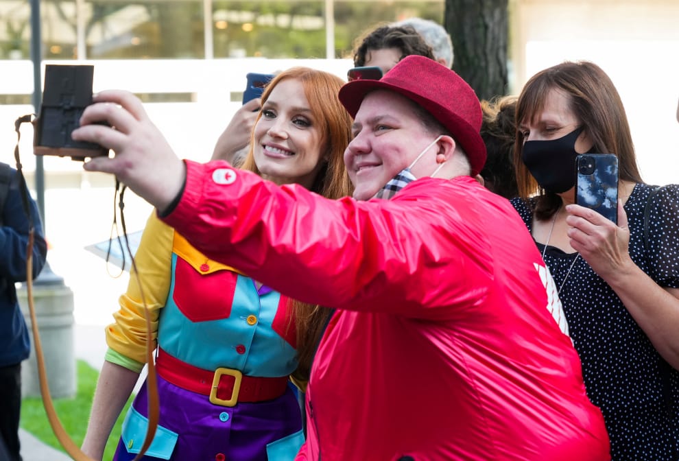 在加拿大安大略省多倫多市(Toronto)的多倫多國際影展上,演員成就獎(Tribute Actor Award)得主潔西卡雀絲坦(Jessica Chastain,左)在記者會後,與一名等在一旁的影迷自拍。
