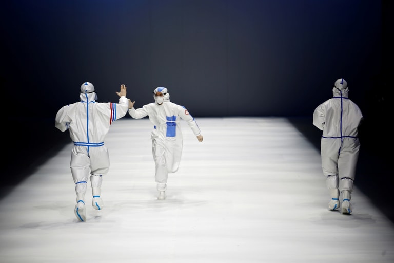 在中國首都北京的中國國際時裝周上,兩名身著全套防護服的模特兒在擦身而過時,互相擊了個掌。