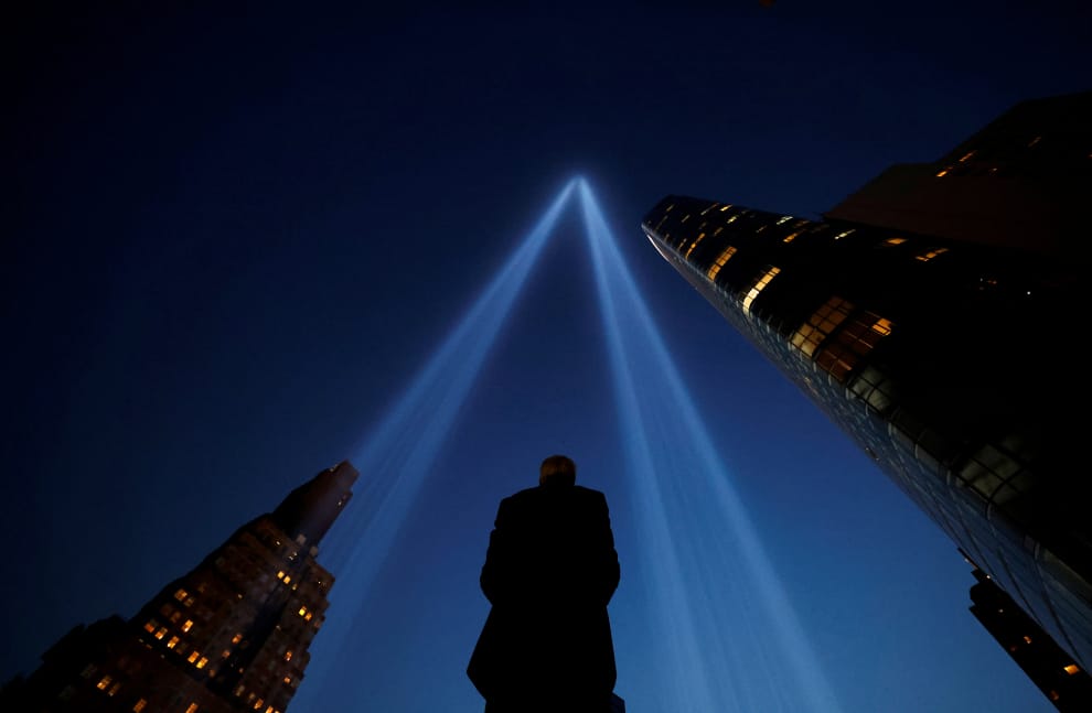 在 911事件滿 20周年這天,民眾來到 911事件的發生現場,拍下紀念藝術裝置「紀念之光」(Tribute in Light)的照片。