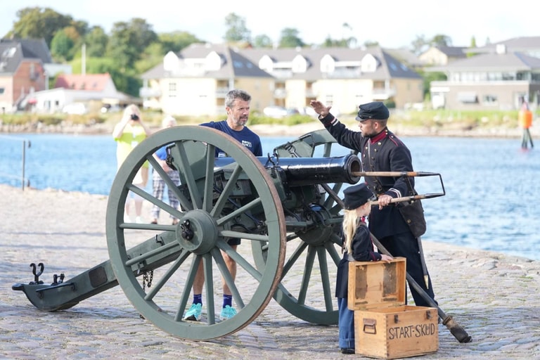 在丹麥南部的森訥堡市(Sønderborg),丹麥王儲弗雷德里克(Frederik, Crown Prince of Denmark,便服男子)出席了南日德蘭郡皇家慢跑活動(Royal Run Sonderjylland),慶祝南日德蘭郡(South Jutland)回歸丹麥滿 100周年。在慢跑活動上,他還站到了一尊古董大炮旁邊,作勢要發射大炮。