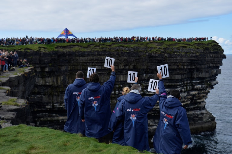 在愛爾蘭北部的唐帕克里克角(Downpatrick Head),2021懸崖跳水世界賽(Cliff Diving World Series)的評審朝著觀眾秀出參賽者的得分。