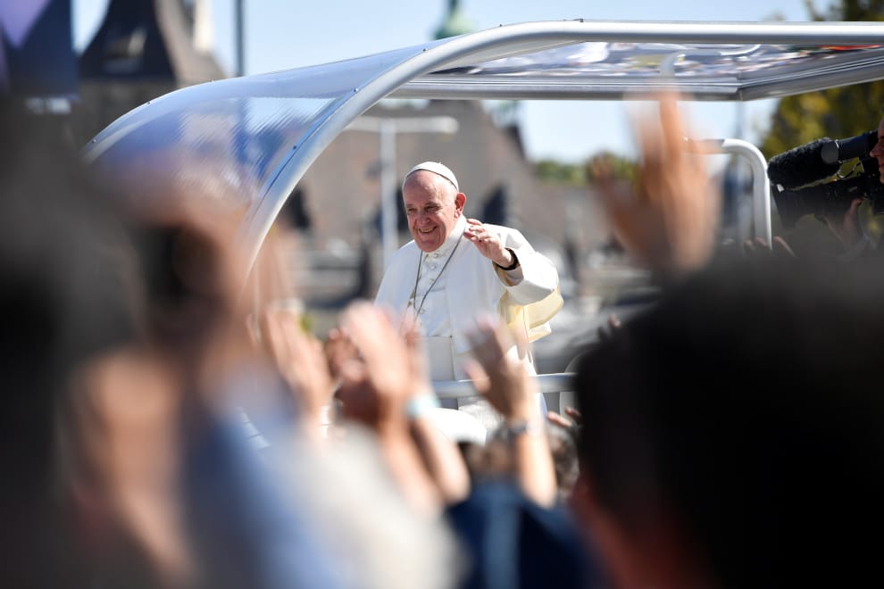 在匈牙利首都布達佩斯(Budapest)的英雄廣場(Heroes' Square),教宗方濟各(Pope Francis)在車子裡向群眾揮手致意。