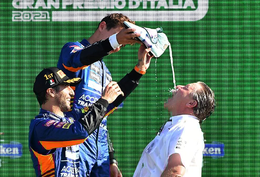 在義大利的蒙札市(Monza),F1車隊麥拉倫(McLaren)的車手里卡多(Daniel Ricciardo,前)和諾里斯(Lando Norris,後)在義大利大獎賽中分別以 1、2名的成績完賽後,開心地以賽車鞋為杯子,將香檳倒入麥拉倫車隊領隊布朗(Zak Brown)的嘴裡。