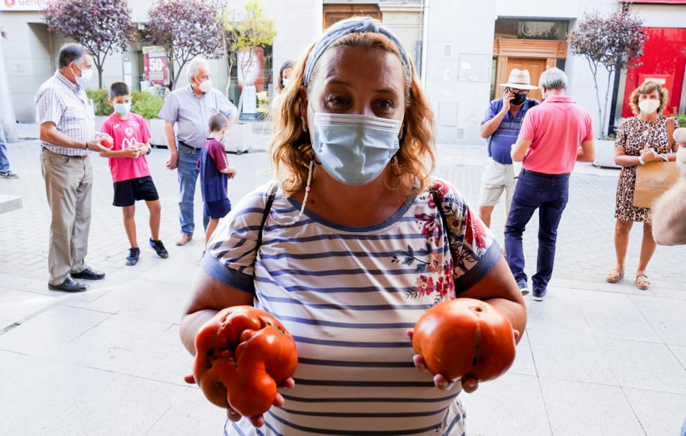 在西班牙圖德拉市(Tudela),一名女子拿著兩顆「圖德拉醜番茄大賽」(Ugly Tomato of Tudela)的「參賽者」拍照。