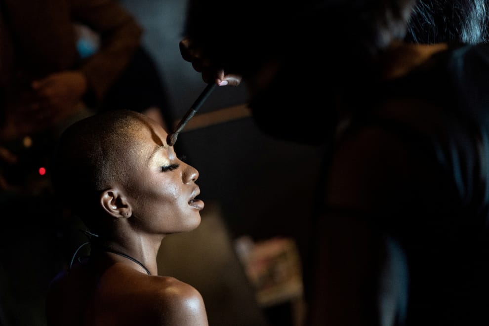 在美國紐約市的曼哈頓區,化妝師正在為一名模特兒上妝,好讓她等會能穿上時裝品牌The Blonds新推出的 2022春夏時裝,走上紐約時裝周(New York Fashion Week)的伸展台。