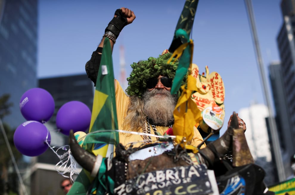 在巴西大城聖保羅,一名示威者換上吸睛的服飾,參與聖保羅人大道(Paulista Avenue)上一場抗議巴西總統波梭奈羅(Jair Bolsonaro)防疫不力、要求國會對他發動彈劾的遊行。