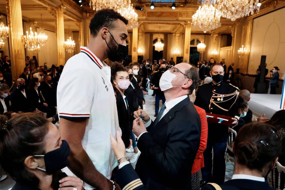在法國首都巴黎的法國總統府愛麗舍宮 (Élysée Palace),法國總理卡斯泰(Jean Castex)正在頒發國家功績勳章(National Order of Merit)給籃球員戈貝爾(Rudy Gobert),表揚他在今夏代表法國參加 2020東京奧運期間立下的汗馬功勞。
