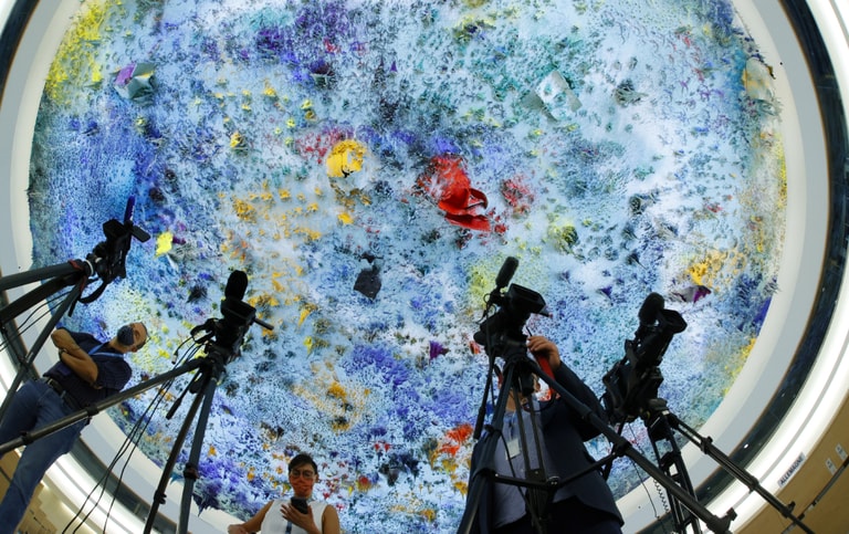 在瑞士大城日內瓦的聯合國日內瓦辦事處(United Nations Office at Geneva),記者們在一座美麗的穹頂之下齊聚,聆聽聯合國人權事務高級專員巴舍萊(Michelle Bachelet)在人權理事會當中的發言。