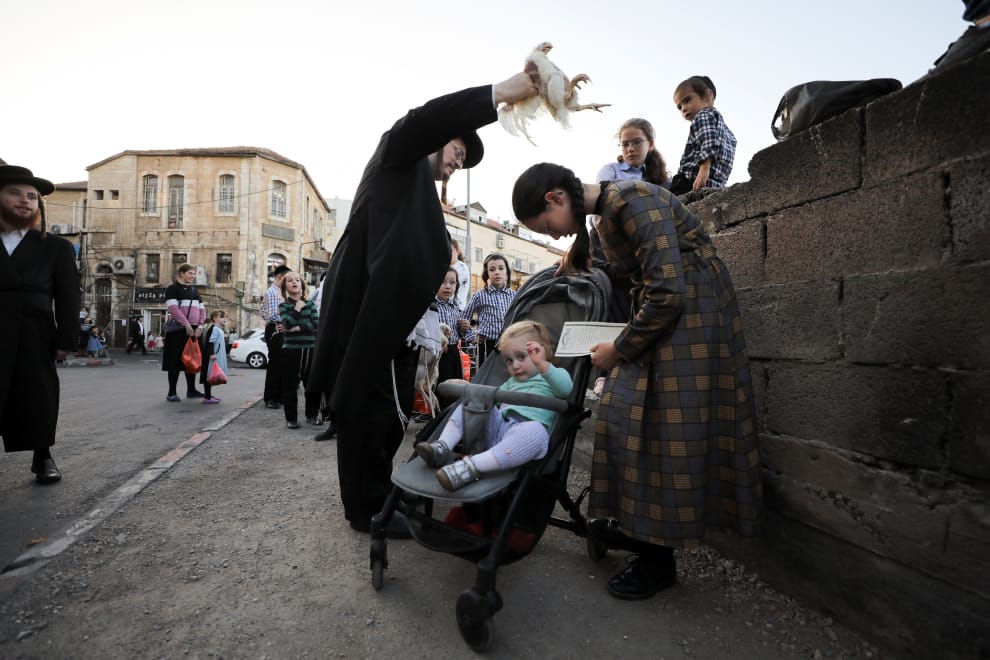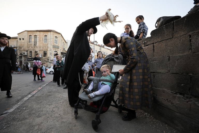 在以色列耶路撒冷市的古老街區百倍之地(Mea She'arim),一名猶太正教(ultra-Orthodox)的信徒正在進行贖罪雞(Kaparot ritual)儀式。