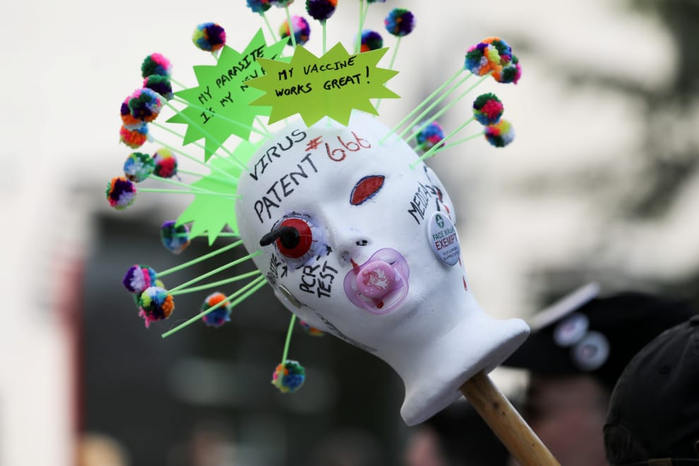 在加拿大安大略省多倫多市,反對當局強制民眾施打COVID-19疫苗政策的示威者高舉假人人頭,在多倫多全科醫院(Toronto General Hospital)外舉行示威活動。
