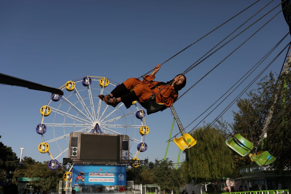 在阿富汗首都喀布爾,一名阿富汗婦女正在一座遊樂公園裡玩遊樂設施。