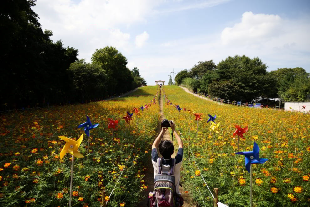 在南韓首都首爾市附近的一座公園,一名男子在走道中舉起相機,拍下看不見盡頭的花海。