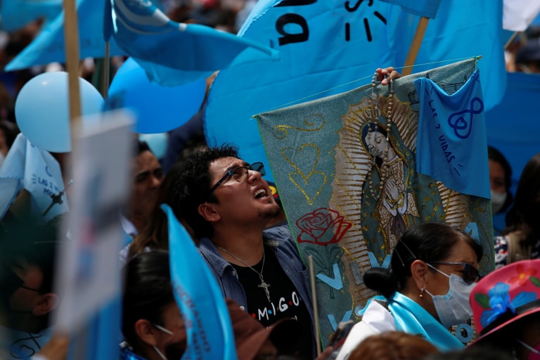 在墨西哥首都墨西哥市,一名天主教信徒帶著聖母像走上街頭,抗議墨西哥最高法院裁定墮胎罪違憲。