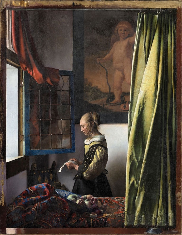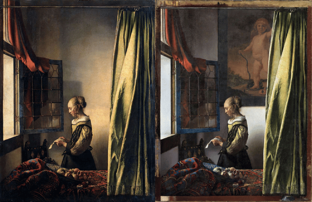 三百年來,沒人發現荷蘭黃金時代畫家維梅爾(Johannes Vermeer,1632-1675)的作品《窗邊讀信的少女》(Girl Reading a Letter at an Open Window)其實有個隱藏版人物,直到收藏這幅畫作的德國德勒斯登(Dresden)歷代大師畫廊(Gemäldegalerie Alte Meister)修復了這幅珍貴的作品,找到了畫中畫──掛在牆上的邱比特畫作。