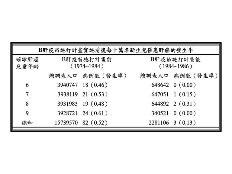 疫苗政策推動十多年,就已看到驚人的效果。1997 年,《新英格蘭醫學期刊/The New England Journal of Medicine》刊出了台灣對幼兒肝癌的研究。數據顯示,1984 年後出生的小孩,兒童肝細胞癌(Hepatocellular Carcinoma)幾乎被消除殆盡。換言之,在B肝疫苗介入以前,台灣幼童的肝癌,幾乎全部都是跟B肝病毒有關的肝細胞癌;疫苗介入後,該癌症逐年減少。近年來,幼童的肝細胞癌已相當罕見了。