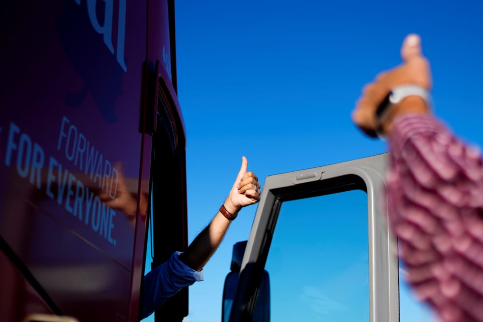 在安大略省惠特比鎮(Whitby)的布魯克林(Brooklin)社區,加拿大現任總理杜魯道(Justin Trudeau)在結束競選活動、返回自己的巴士上時,對著外頭的支持者比出了大大的讚。