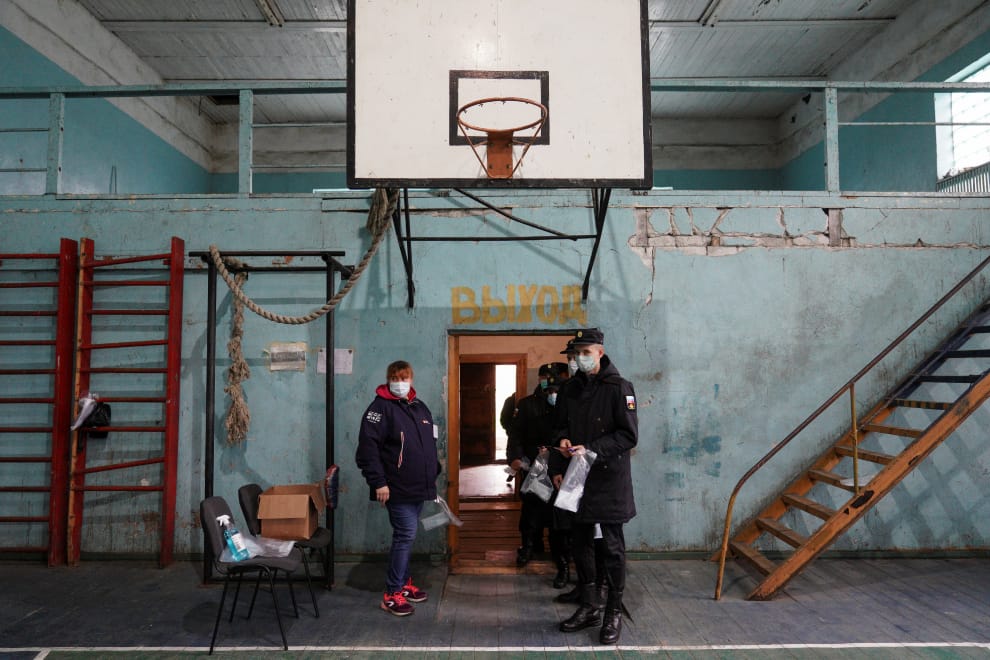 今年 9月17日至 9月19日為俄國的議會選舉。本照攝於加里寧格勒州(Kaliningrad region)的村莊里亞賓諾夫卡(Ryabinovka),一群俄國軍人們正在一間體育館內排隊等候投票。