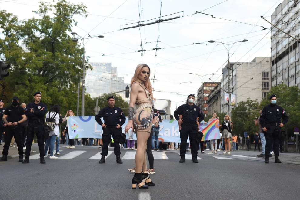 塞爾維亞一年一度的同志大遊行於首都貝爾格萊德(Belgrade)盛大展開。畫面中,一名參與活動的同志權倡議人士正對著鏡頭擺出留影的姿勢,他的身後則站著數名駐守現場的防暴警察,以及拿著遊行布條的其他與會民眾。