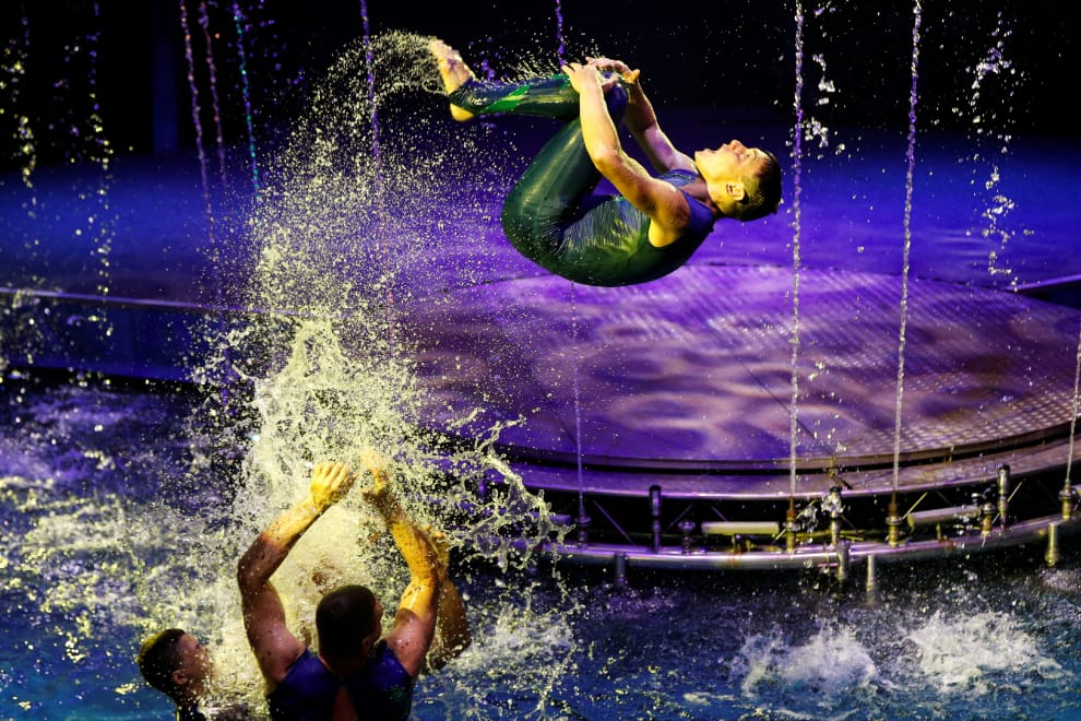 在首都基輔(Kyiv),國家馬戲團(National Circus)正在展示新的表演節目「Aquatoria:水上馬戲團」(Aquatoria. Circus on Water)。畫面中,一名雜技演員自水面翻滾飛躍,在空中帶出美麗的水花。