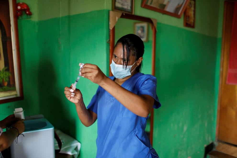 在首都卡拉卡斯(Caracas),配合政府的新COVID-19防疫政策,醫護人員正挨家挨戶地為行動不便的年長者施打疫苗。畫面中,一名護理人員正在準備中國國藥集團(Sinopharm)疫苗。